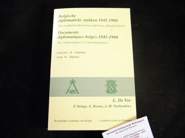 BELGIEN.– VOS, Luc de: Defense 1941 – 1960. Documents Diplomatiques Belges 1941 – 1960. De l’independance a l’interdependance. Tome II. o.O. (Academie Royale), 1998. Gr. 8°. 582 S. ill. OKart. Ordnungsgemäß aus Bundeswehrbeständen ausgesondertes Bibliotheksexemplar (Rückenschild, Stempel). EA.