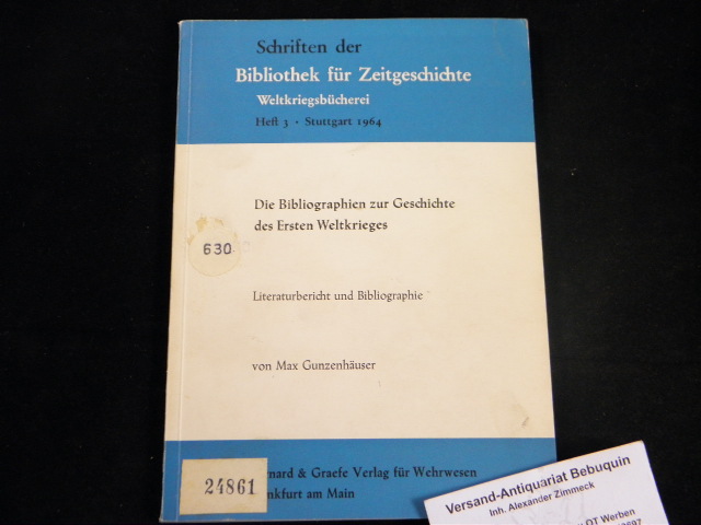 1. WELTKRIEG.– GUNZENHÄUSER, Max: Die Bibliographien des Ersten Weltkrieges. Literaturbericht und Bibliographie. Frankfurt (Bernard & Graefe), 1964. 64 S. OKart. Ordnungsgemäß aus Bundeswehrbeständen ausgesondertes Bibliotheksexemplar (Stempel und Rückenschild). = Schriften der Bibliothek für Zeitgeschichte, Heft 3. EA.