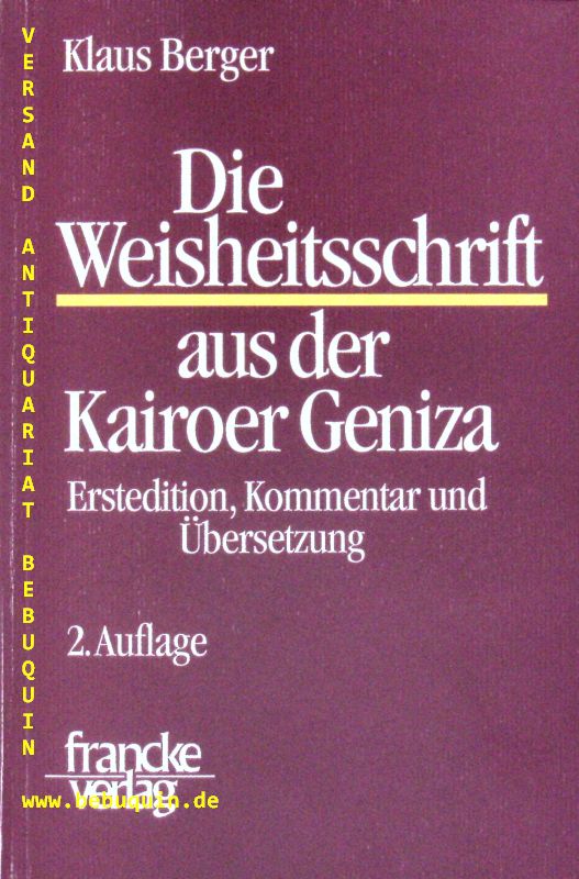 BERGER, Klaus: Die Weisheitsschrift aus der Kairoer Geniza. Erstedition, Kommentar und Übersetzung. 2. Aufl. Tübingen (Francke), 1989. Gr. 8°. 422 + 18 Bildtafeln. OKart. = Texte und Arbeiten zum neutestamentlichen Zeitalter, 1.