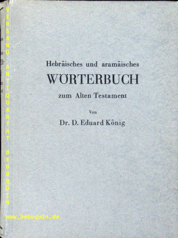 WÖRTERBÜCHER.– KÖNIG, Eduard: Hebräisches und aramäisches Wörterbuch zum Alten Testament. Mit Einschaltung u. Analyse aller schwer erkennbaren Formen, Deutung d. Eigennamen sowie d. massoret. Randbemerkungen und einem dt.-hebr. Wortregister. 6. u. 7. Aufl. Leipzig (Dieterich), 1936. Gr. 8°. X, 681 S. OHLn. NaV wichtiges Nachschlagewerk in der Original Ausgabe.
