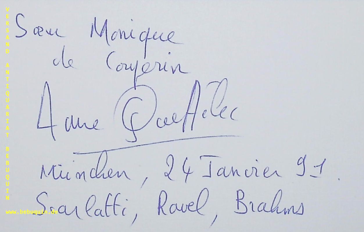 QUEFFELEC, Anne (Pianistin): eigenhändig signierte und datierte Autogrammkarte. München (Philharmonie), 24.1.1991. 8 x 12,5 cm. Karteikarte. Anne Queffélec (* 17. Januar 1948 in Paris, Frankreich) ist eine französische Pianistin. (Wikipedia)