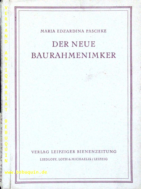 BIENEN.– PASCHKE, Maria Edzardina: Der neue Baurahmenimker. Leipzig (Leipziger Bienenzeitung), 1948. 220 (8) S. mit zahlr. Abb. OKart. Rücken angeplatzt, etwas gelockert. EA.