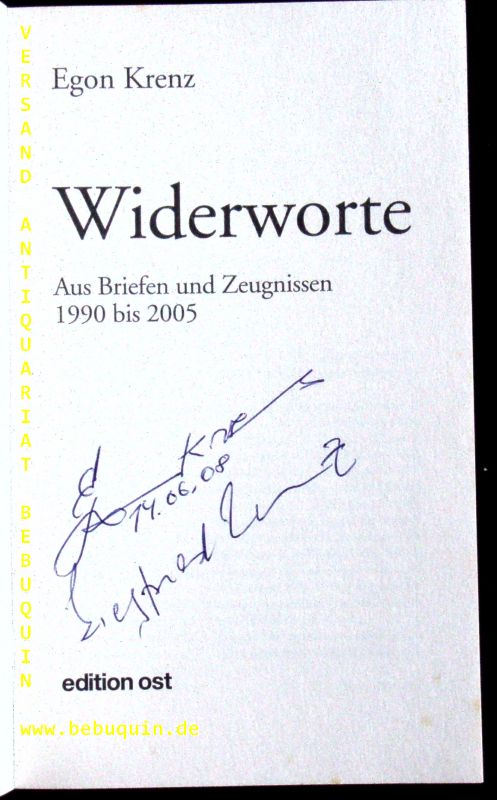 KRENZ, Egon: Widerworte. Aus Briefen und Zeugnissen 1990 bis 2005. 2., erw. und erg. Aufl. des Bd. „Briefe und Zeugnisse“. Berlin (Ost), 2006. 287 S. OKart Schnitt etwas fleckig. Mit der eigenhändigen datierten Signatur des Verfassers auf Titelseite.