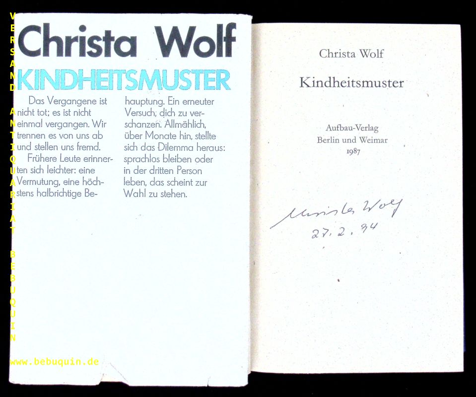 WOLF, Christa: Kindheitsmuster. 11. Aufl. Berlin (Aufbau), 1987. 530 S. OLn. mit OUmschl. Umschlag gering lädiert. Mit der eigenhändigen datierten Signatur der Dichterin auf Titelseite.
