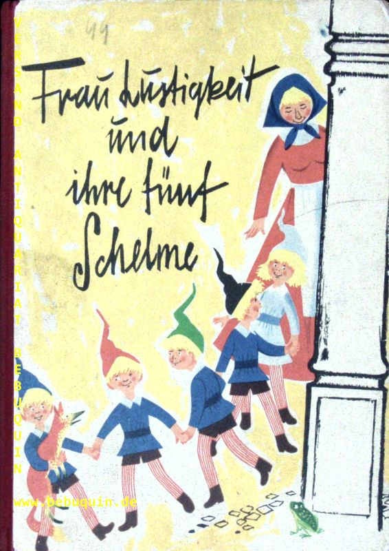 WELSKOPF-HENRICH, Liselotte: Frau Lustigkeit und ihre fünf Schelme. Berlin (Groszer), 1958. Gr. 8. 88 S. mit farb. Bildern von Karl Fischer. farb. ill. OHLn. vorderes Gelenk gelockert, bestaubt. EA.