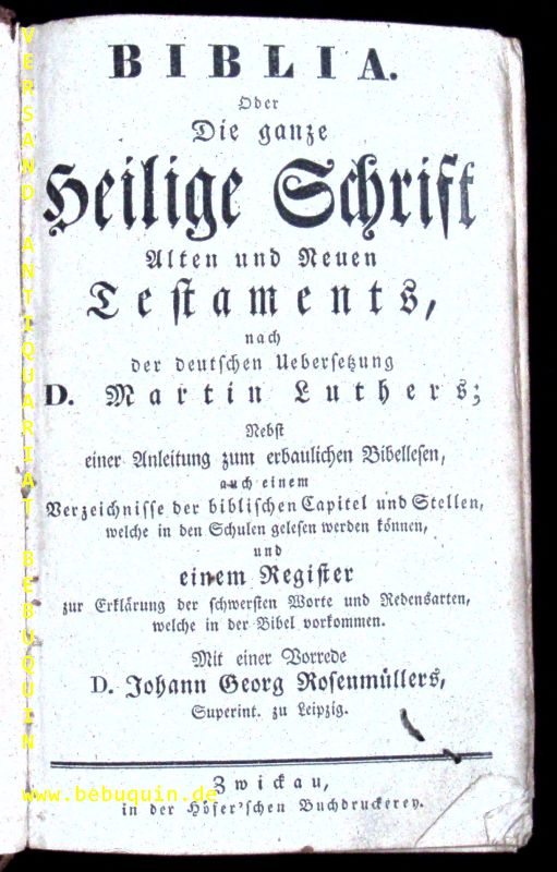 BIBEL.– DIE BIBEL.– Das ist: Die ganze Heilige Schrift Alten und Neuen Testaments. Nach der deutschen Uebersetzung d. Martin Luthers; Nebst einer Anleitung zum erbaulichen Bibellesen auch einem Verzeichniß der biblischen Capitel und Stellen, welche in den Schulen gelesen werden können, und einem Register zur Erklärung der schwersten Worte und Redensarten, welche in der Bibel vorkommen. Mit einer Vorrede von D. Johann Georg Rosenmüller, Superintendent in Leipzig. Zwickau (Höfersche), (1806). (8 S.) Vorrede, (12 Bl.) Register, 1152 S., 316 S., (2 Bl.) OLdr. bzw. Leder der Zeit mit den fragmentarisch erhaltenen Schließen. Kanten teils stärker berieben und angeplatzt, innen kaum gelockert. recht seltene sächsische Bibel.