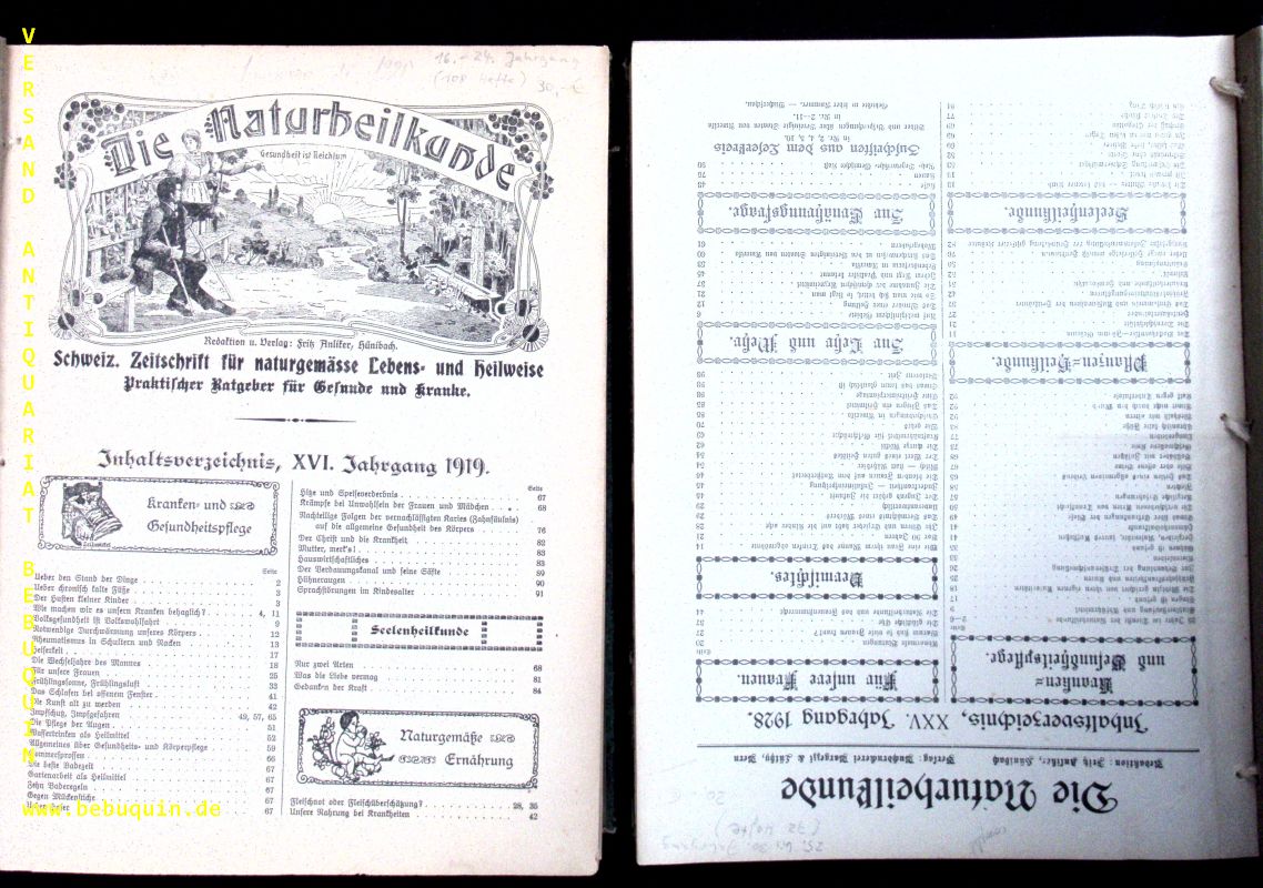 MEDIZIN.– ANLIKER, Fritz: (Hrsg.) Die Naturheilkunde. Schweizerische Zeitschrift für naturgemässe Lebens-und Heilweise. Praktischer Ratgeber für Gesunde und Kranke. 16. – 30. Jahrgang mit 180 Heften. 2 Bände. Bern (Bargezzi & Lüthy), 1919 – 1933. Oktav. ca 800 S. mit zahlr. Abb. HLn der Zeit mit Fadenbindung. eine Lage etwas gelockert, sonst gut erhalten. umfangreiche geschlossene Reihe der seltenen Zeitschrift.