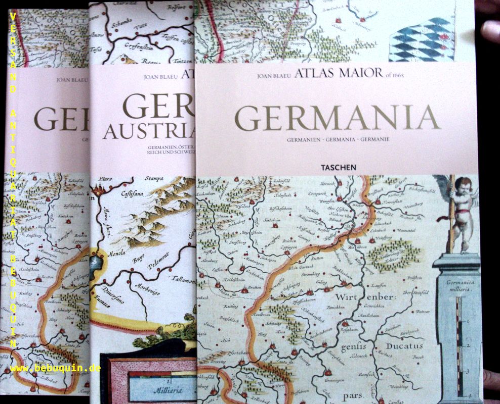 ATLANTEN.– BLAEU, Joan: Atlas maior of 1665. Germania : Deutschland, Österreich, Schweiz : 100 Tafeln mit Karten von Germanien, Österreich und der Schweiz sowie Originaltexte von Joan Blaeu aus seinem Atlas maior von 1665, „dem größten und prachtvollsten Atlas, der jemals veröffentlicht wurde“ = 100 plates with maps of Germania, Austria and Switzerland, and the original commentaries from Joan Blaeu’s atlas maior of 1665, „the greatest and finest atlas ever published“ : nach dem Original aus der/based on the copy in the Österreichische Nationalbibliothek, Wien. Nachdruck. 2 Bände. Köln (Taschen), 2006. Fol. 216 S. + (S. 217-404) mit zahlr. farb. Abb. und 124 farb. Karten. OPb mit OUmschl. in OSchuber. tadellos.