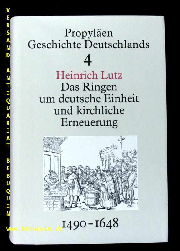 PROPYLÄEN GESCHICHTE DEUTSCHLANDS.– LUTZ, Heinrich: Das Ringen um deutsche Einheit und kirchliche Erneuerung. Von Maximilian I. bis zum Westfäl. Frieden 1490 – 1648. Berlin (Propyläen), 1983. 4°. 502 S. mit zahlr. Abb. OHLdr mit OUmschl. in OSchuber. tadellos. = Propyläen-Geschichte Deutschlands, Bd. 4.
