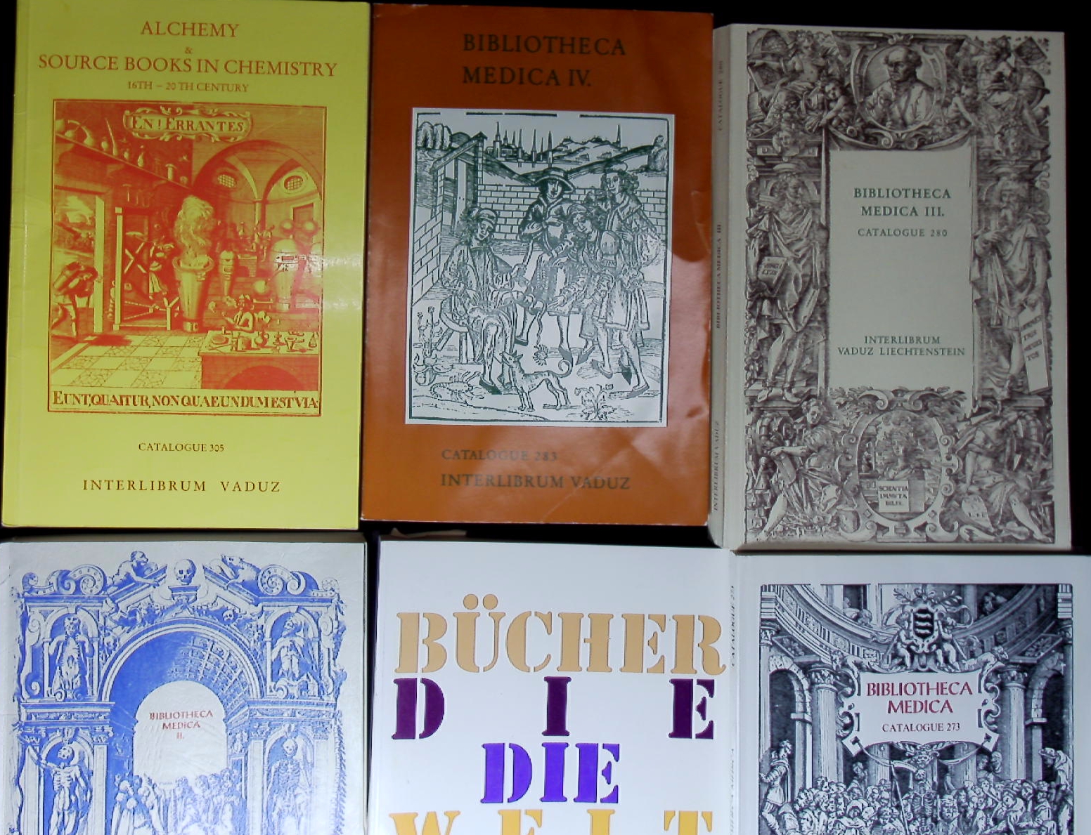 KATALOGE.– INTERLIBRUM VADUZ: 16 Antiquariatskataloge. No 248, 254, 260, 269, 273, 275, 276, 280, 283, 300, 305, 309, 331 und dazu die Catalogue of Catalogues, Pein und Anesthesia sowie Brain, Nerves, Neurology. 16 Bände. Vaduz. ca 1980 ff. Gr. 8°. jeweils zwischen 100 und 300 S. mit zahlr. Bildern. ill. OKart. Band 254 etwas bestoßen, vereinzelte Marginalien, sonst sehr ordentlich. Sehr interessante und voluminöse Sammlung. Mit dem legandären Band 305 „Alchemy & Source Books in Chemistry“.