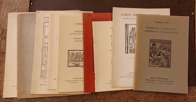 KATALOGE.– HERTZBERGER, Menno: 9 Antiquariatkataloge. Medical Books and Early Science. 9 Bände. Amsterdam, Baarn (Hertzberger), 1965 – 1980. jeweils ca 50 bis 150 S. mit zahlr. Bildern und Bildtafeln. ill. OKart. teils etwas bestoßen, vereinzelt Marginalien und Klebereste. Schöne Sammlung von katalogen des antiquarischen Urgesteins.