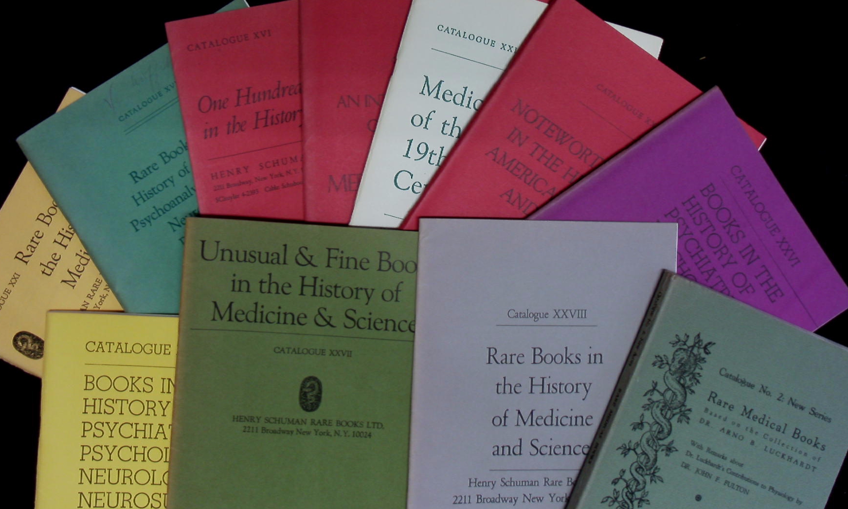 KATALOGE.– SCHUMAN, Henry: 35 Antiquariatskataloge: Nr. 2, 3, 5, 6, 7, 16, 17, 21, 22, 24 – 28, 30 – 37, 39 – 41, 75, 76A, AA, L, M. rare Books of Medical Miscellany an other Sciences. 35 Bände. New York (Schuman), 1938 – 1990. Gr. 8°. jeweils ca 50 – 100 S. mit zahlr. Abb. ill. OBr. die frühen Hefte teils lädiert, sonst nur selten bestaubt oder mit Marginalien, umgangreiche Katalog-Sammlung des bedeutenden Wissenschafts-Antiquars.