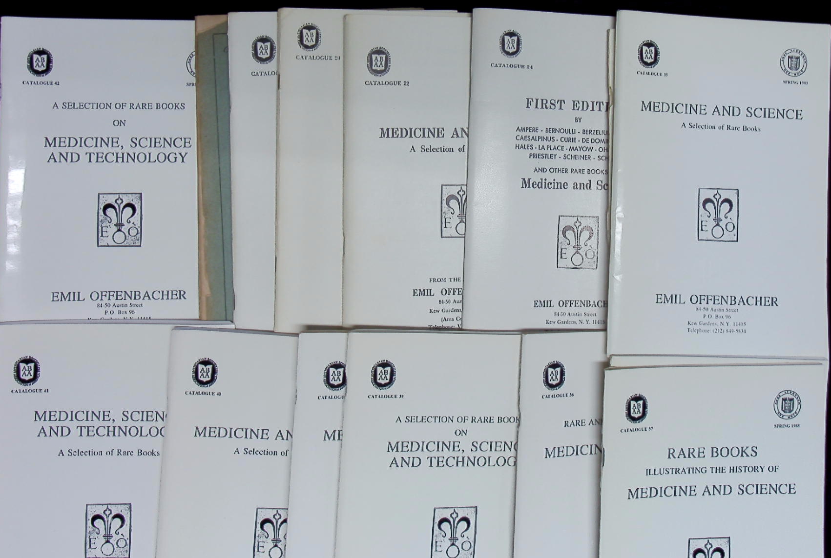 KATALOGE.– OFFENBACHER, Emil: 25 Antiquariatskataloge: Nr. 1, 2, 15, 18, 20, 22, 24 – 42. Medicine – Science – Technology. 25 Bände. Kew Gardens (Offenbacher), 1942 – 1990. Gr. 8°. jeweils ca 50 S. ill. OKart. vereinzelte Marginalien. Fast lückenlose Folge der berühmten Katalogreihe.