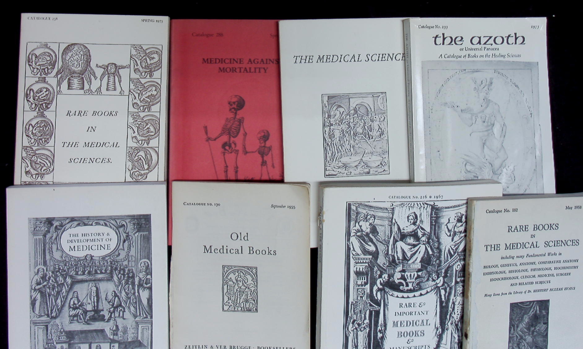 KATALOGE.– ZEITLIN & VER BRUGGE: 13 Antiquariatskataloge: Nr. 170, 182, 216, 221, 233, 238, 240, 245, 252, 260, 270, 281, 288 Rare Books in The Medical Sciences. 13 Bände. Los Angeles (Zeitlin & Ver Brugge) 1955 – 1986. 8°, Gr. 8° + 4°. jeweils zwischen 50 und 150 S. mit zahlr. Abb. ill. OKart. leichte Gebrauchsspuren. Interessantes Lot der berühmten amerikanischen Katalogreihe.