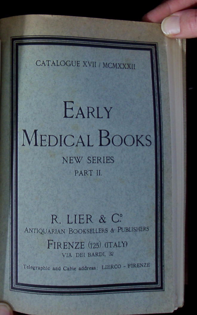 KATALOGE.– LIER, R.A.T.: 16 Antiquariatskataloge: Part I + II, IV – X + New Series Part I + II + Catalogue XVIII, XX, XXI, XXIV. Old Medicine and Science. 16 Bände in 1 Bd. Fiorenze (Lier), 1923 – 1953. 8°, Gr. 8° + 4°. jeweils zwischen 50 und 100 S. mit zahlr. Abb. ill. OKart. in neuem Leinenband. wenige Marginalien. Interessantes Lot der berühmten italienischen Katalogreihe.