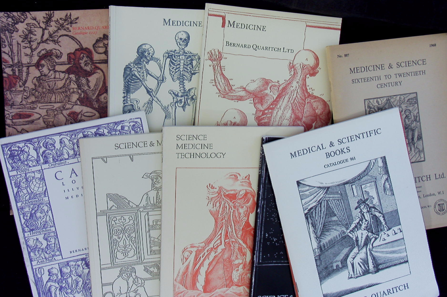 KATALOGE.– QUARITCH, Bernard: 11 Antiquariatskataloge: No 887, 911, 961, 1029,1038, 1041, 1068, 1072, 1080, 1127 und Bulletin 14. Old Medicine and Sciences. 11 Bände. London (Quaritch), 1968 – 1990. Gr. 8°. jeweils zwischen 50 und 100 S. mit zahlr. Abb. ill. OKart. wenige Marginalien. Interessantes Lot mit Katalogen aus dem berühmten englischen Spezialantiquariat. Bernard Quaritch (* 23. April 1819 in Worbis; † 17. Dezember 1899 in Hampstead) war ein englischer Buchhändler und Antiquar deutscher Abstammung. (Wikipedia)