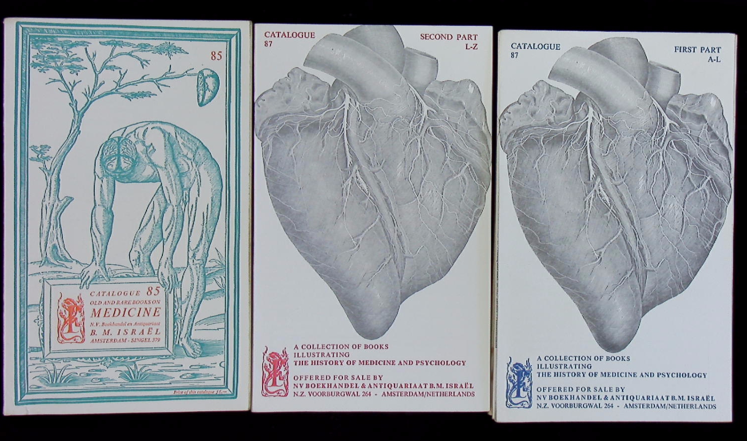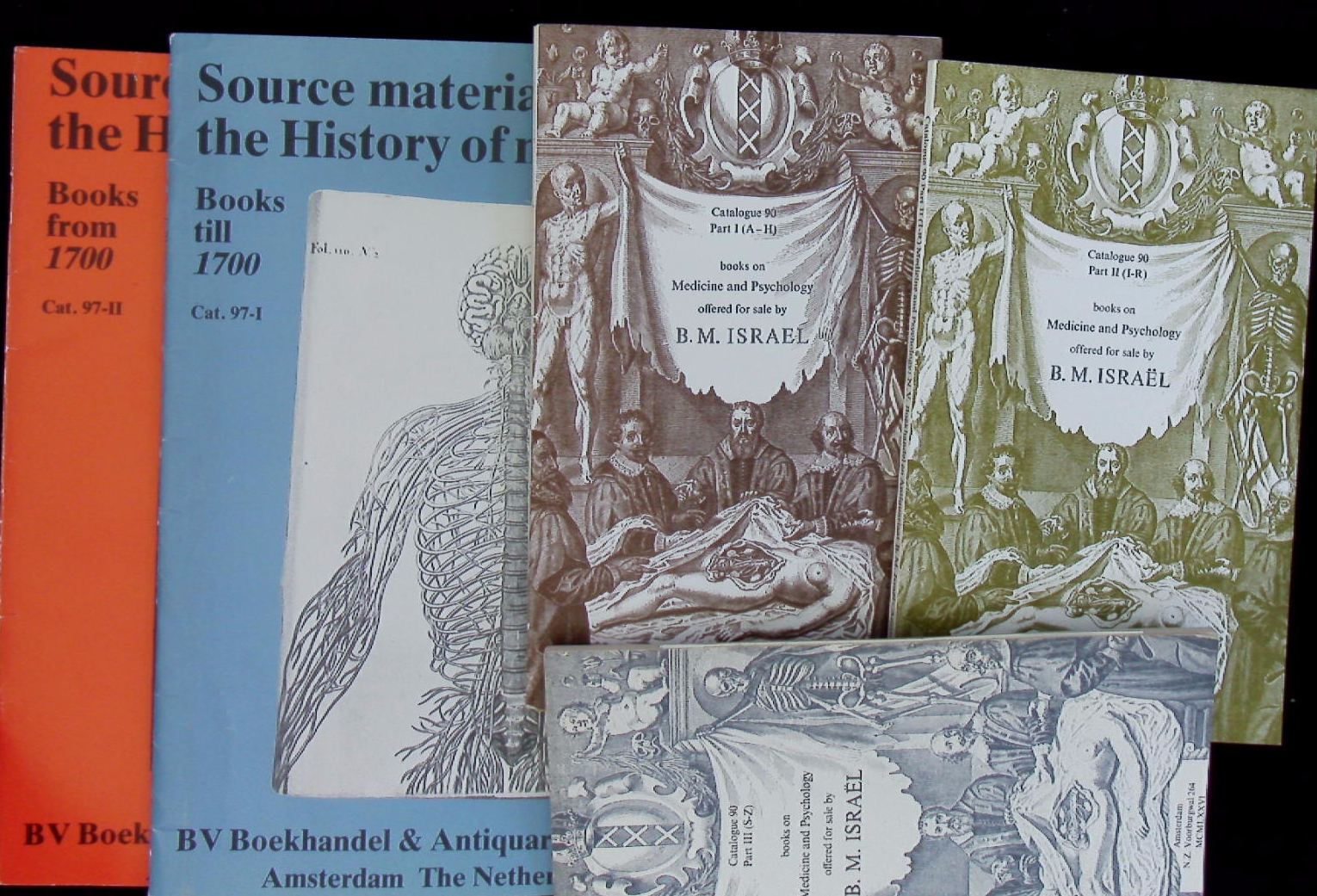 KATALOGE.– ISRAEL, B.M.: 5 Antiquariatskataloge: No 82, 85, 87, 90, 97 Old and rare Medicine and Sciences. 5 Kataloge in 9 Bänden. Amsterdam (Israel) 1968 – 1990. Gr. 8°. jeweils zwischen 50 und 100 S. mit zahlr. Abb. ill. OKart. teils umfangreiche Anstreichungen. Interessantes Lot mit Katalogen aus dem berühmten holländischen Spezialantiquariat.