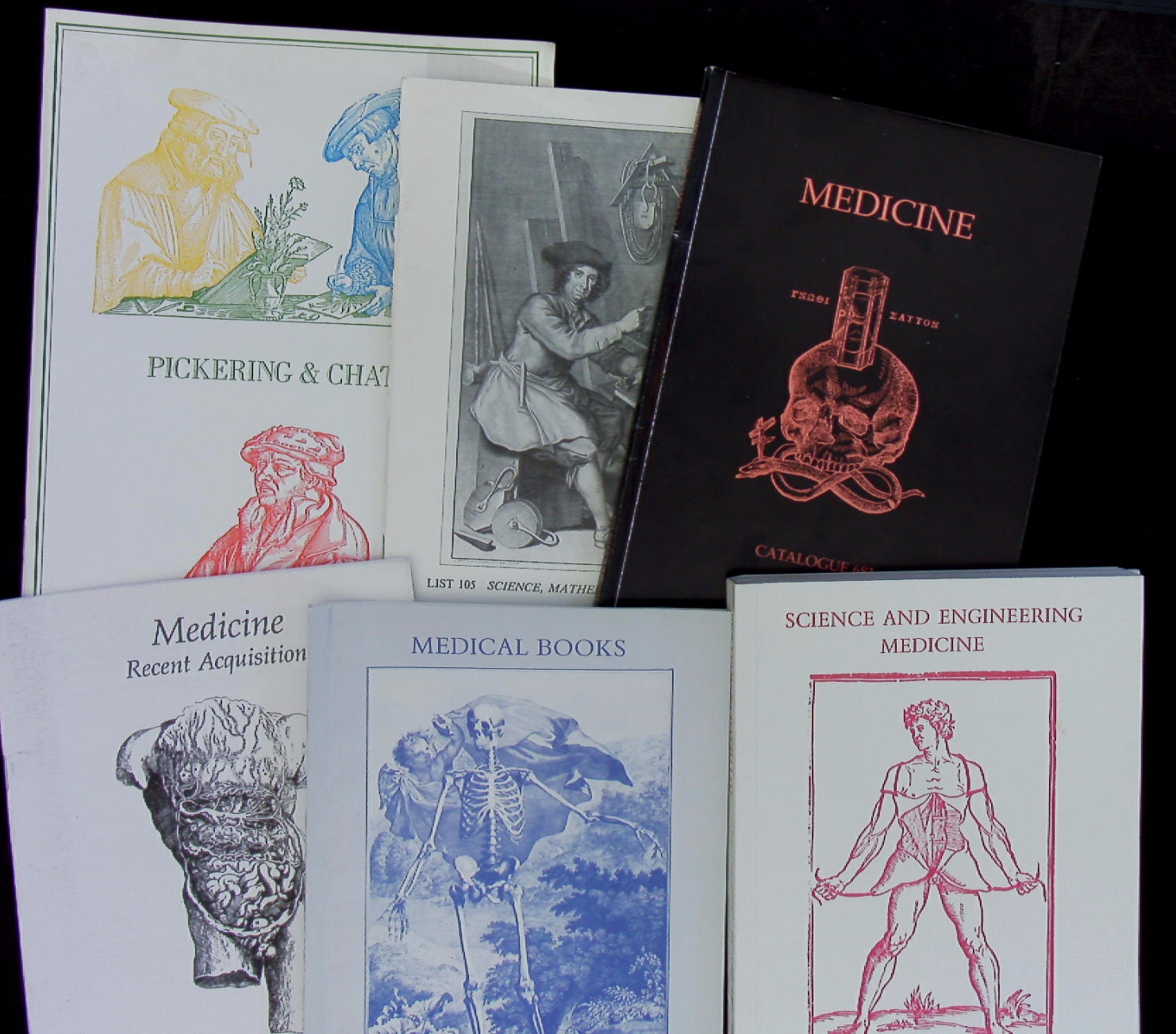 KATALOGE.– PICKERING & CHATTO: 6 Antiquariatskataloge: No 105, 123, 663, 657, 681, 685. Medicine etc. 6 Bände. London (Pickering), 1986 – 1990. jeweils zwischen 50 und 200 S. mit zahlr. Abb. ill. OKart. wenige Marginalien. Schöne Sammlung zum Thema Psychologie.