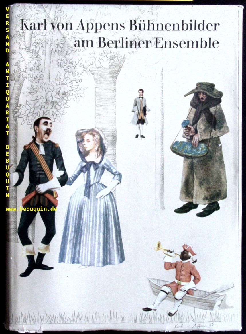 APPENS.– DIECKMANN, Friedrich: Karl von Appens Bühnenbilder am Berliner Ensemble. Szenenbilder, Figurinnen, Entwürfe u. Szenenphotos zu 18 Aufführungen. 2., durchges. Aufl. Berlin (Henschel), 1973. Gr. 4°. 405 S. Mit 106 farb. u. 594 Schwarz-Weiß-Abb. OLn mit OUmschl. gutes Ex.