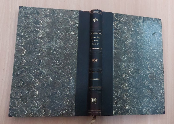 NIETZSCHE, Friedrich: Morgenröthe. Gedanken über die moralischen Vorurtheile. Leipzig (Kröner), 1917. Gr. 8°. 384 (2) S. OHLdr mit goldgeprägtem Rücken. NaV, gutes Ex. = Werke, 1. Abt. Bd. IV. Kriegsausgabe mit Zollstempel. Nicht bei Knoche.