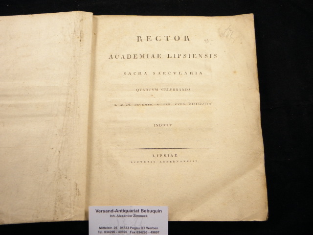 LEIPZIG.– RECTOR ACADEMIAE LIPSIENSIS.– Sacra saecularia quartum celebranda a. d. IV. Dec. a. aer. vulg. 1809 indicit. Leipzig (Ackermann), 1809. 4°. 26 S. InterimsBr. Kanten etwas bestoßen, gutes Ex. EA.