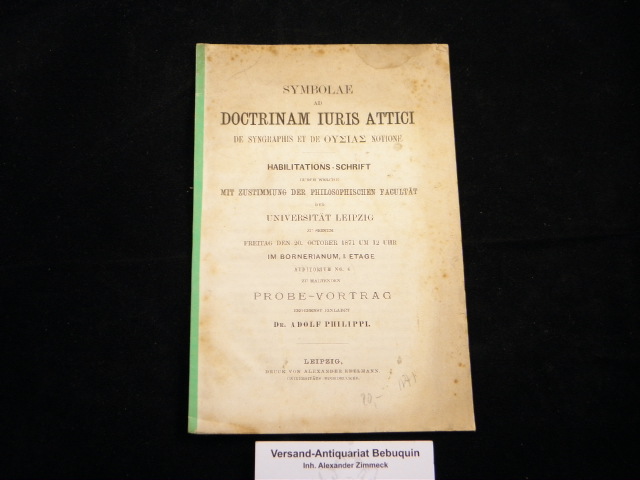 LEIPZIG.– PHILIPPI, Adolf: Symbolae ad Doctrinam Iuris Attici de Syngraphis et de (.) Natione. Habilitations-Schrift der Universiät Leipzig. Leipzig (Edelmann), 1871. 18 S. Interimsrücken. etwas braunfleckig und Wasserrandig. EA.