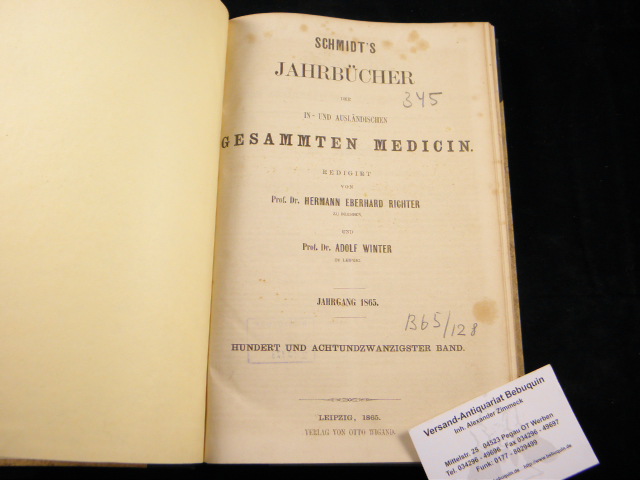 MEDIZIN.– SCHMIDT’S JAHRBÜCHER DER IN- UND AUSLÄNDISCHEN GESAMMTEN MEDICIN.– 128. Bd. Redigirt von Hermann Eberhard Richter und Adolf Winter. Leipzig (Wigand), 1865. 4°. 400 S. HLn der Zeit mit goldgeprägten Rücken. Rücken angeschmutzt, Bibliotheksexemplar (Rückenschild, Stempel), gutes Ex.