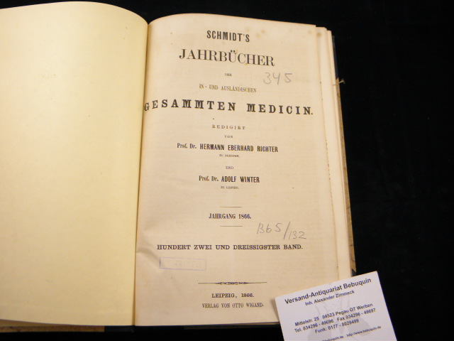 MEDIZIN.– SCHMIDT’S JAHRBÜCHER DER IN- UND AUSLÄNDISCHEN GESAMMTEN MEDICIN.– 132. Bd. Redigirt von Hermann Eberhard Richter und Adolf Winter. Leipzig (Wigand), 1866. 4°. 396 S. HLn der Zeit mit goldgeprägten Rücken. Rücken angeschmutzt, Bibliotheksexemplar (Rückenschild, Stempel), gutes Ex.