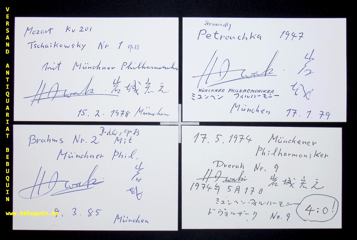 IWAKI, Hiroyuki (Dirigent): 6 eigenhändig signierte und datierte Autogrammkarten mit teils ausführlichen eigenhändigen Kommentaren. München, 1972 – 1993. 8 x 12,5 cm. 6 Karteikarte. Hiroyuki Iwaki (6 September 1932 – 13 June 2006) was a Japanese conductor and percussionist. (Wikipedia)
