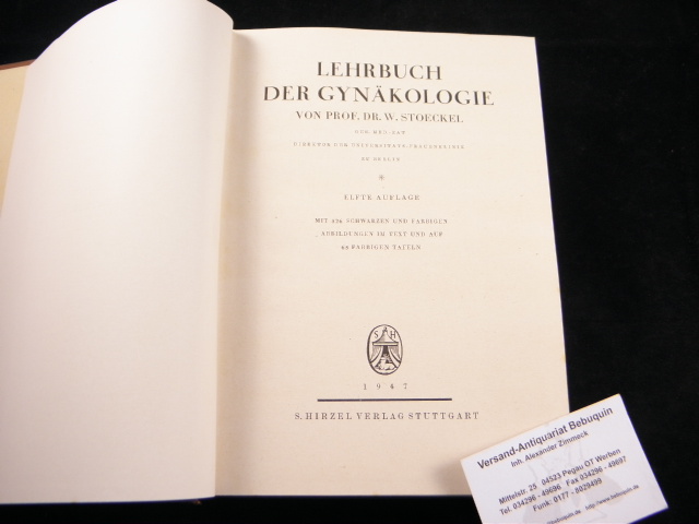 MEDIZIN.– STOECKEL, W.: Lehrbuch der Gynäkologie. 11. Aufl. Stuttgart (Hirzel), 1947. Gr. 8°. XVI; 828 S. mit 526 schwarzen udn farbigen Abb. im Text und auf 65 farb. Tafeln. OLn mit Goldprägung. leicht bestaubt, sonst gut erhalten.