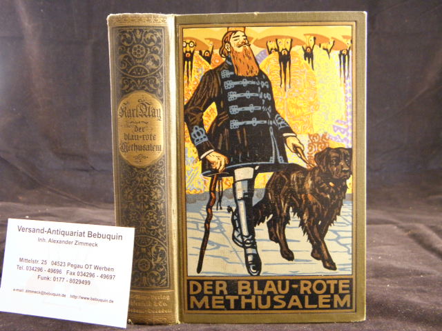 MAY, Karl: Der blaurote Methusalem. Eine lustige Studentenfahrt nach China. Volksausgabe. 104.– 120. Tsd. Radebeul (Karl May), 1931. 569 (3) S. farb. ill. OHLn. unteres Kap etwas gestaucht, NaV, sonst schönes Ex. mit farbstarkem Deckel und goldglänzendem Rücken. = Gesammelte Werke, Bd. 40.