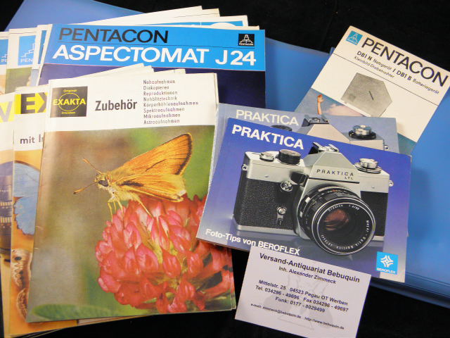 TECHNIK.– PENTACON DRESDEN MAPPE.– 30 Hefte zu verschiedenen Fotoapparaten. Bedeinungsanleitungen, Zuberhör etc. Dresden (Pentacon), ca 1970. unterschiedliche Formate. jeweils zwischen 12 und 100 S. mit teils farb. Bildern. ill. OBr. in OPlast.Mappe mit Weiß– und Schwarzprägung. gute Erhaltung, wenige doppelt. Opulente Sammlung mit folgenden Einzeltiteln: Foto-Tips von BEROFLEX für Praktica LTL + LLC, Exakta Zubehör, Exakta Zubehör VX 500 + VX 1000, Exakta RTL 1000, Exakta VX 500, RTL 1000, VX 500, VX 1000, Reflex Kreis 8 mit großem Fotowettbewerb, Reflex Kreis 9, Rentacon Aspectomat J24, Practica L,Aspectar N24, Pentacon super, Pentacon Zubehör für Spiegelrefelxkameras, Practica super TL, Praktica L, Praktica LTL, Objective für Spiegelrefelxkameras, Praktica LLC, Praktica super TL, Praktica LTL, Pentacon six TL, Praktica LLC, Praktica L, Praktica nova I, Pentacon ZUbehör echter einäugiger Spiegelreflexkameras, Pentacon Sie besitzen nur die Hälfte!, Praktica nova I.