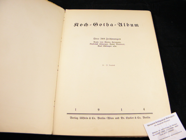 KOCH-GOTHA.– HERMANN, Georg; SCHANZER, Rudolf; BRENNERT, Hans; ETTLINGER, Hans u.a.: Koch-Gotha-Album. Über 200 Zeichnungen. 11.– 20. Tsd. Wien, Berlin (Ullstein / Eysler), 1914. Fol. 111 S. mit zahlreichen sw. Abb. von Fritz Koch-Gotha. OHLn. Einband etwas gebräunt, Gelenke etwas gelockert, sonst gut erhalten.