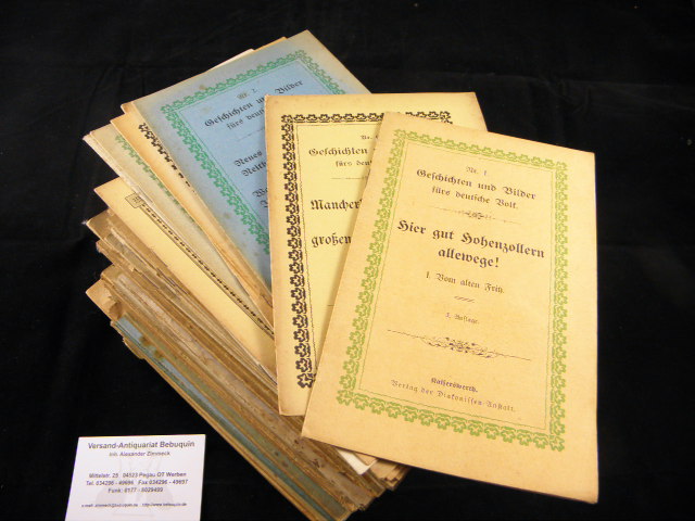 KOLONIEN.– CA 60 PUBLIKATIONEN DER RHEINISCHEN MISSIONSGESELLSCHAFT.– Mit historischem und kolonialem Inhalt. Kaiserwerth (Diakonissen-Anstalt), 1899 – 1940. jeweils ca 100 S. mit teils farb. Bildern. ill. OBr. teils bestaubt, unterschiedliche Erhaltung. dabei Julius Disselhoff: Königin Elisabeth, Albrecht Dürer, Krieg 1870/71, Karl vom Stein + Geschichten und Bilder fürs deutsche Volk (über 20 Einzelhefte), 20 Jahrbücher für christliche Unterhaltung uva.