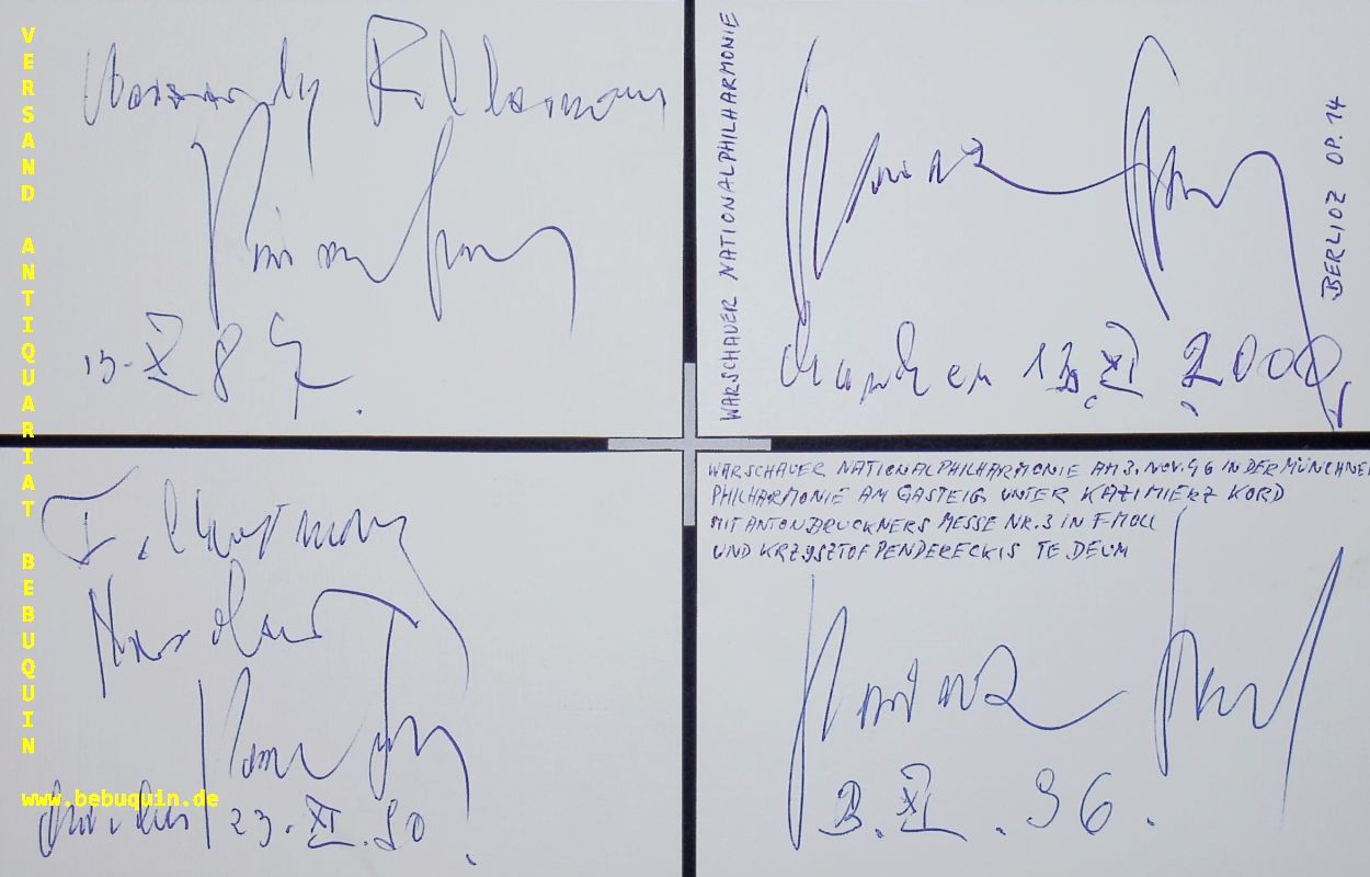 KORD, Kazimierz (Dirigent): 5 eigenhändig signierte Autogrammkarten. München (Kongresssaal), 1974 – 2000. 8 x 12,5 cm. 5 Karteikarten. Kazimierz Kord (born 18 November 1930) is a Polish conductor. Between 1949 and 1955, he studied piano at the Leningrad Conservatory. He also studied at the Academy of Music in Kraków. (Wikipedia)