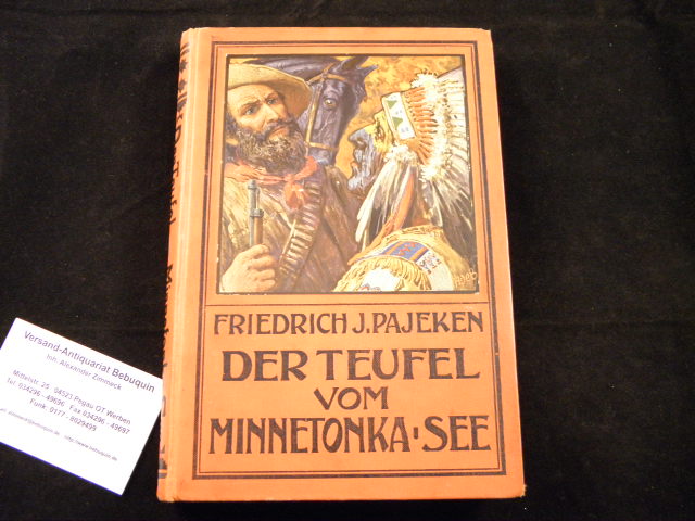 PAJEKEN, Friedrich J.: Der Teufel vom Minnetonka-See. Eine Erzählung aus dem Westen Nordamerikas für die reifere Jugend. Leipzig (Gehlen), 1914. Gr. 8°. 248 S. mit 4 farb. und 4 einfarb. Vollbildern von H. de Bruycker und einem 16seitigen Werbeanhang sowie interessanten Farbvorsätzen. ill. OLn. eine Tafel lose, einige Seiten mittig mit Fleck. EA. Klotz 5284/27. Friedrich Joachim Pajeken (Bremen 1855 – 1920) war Kaufmann und Verfasser von Abenteuerromanen für Jugendliche. „1876 wurde er als Kaufmann nach Ciudad Bolívar am Orinoko geschickt, wo er in den nächsten drei Jahren Erfahrungen im Überseehandel sammelte. Seinen dortigen Aufenthalt nutzte er für zahlreiche Streifzüge durch das Land. Nebenbei befasste er sich eingehend mit den in Bolivien lebenden Indianern. Um auch die nordamerikanischen Indianer kennenzulernen, begab er sich für zwei Jahre auf die ‚Hollers Ranch‘ am Brod River in den Bighorn Mountains und knüpfte gute Kontakte zu den dort lebenden Indianern. Von diesen erhielt er aufgrund seiner etwas gelblichen Hautfarbe und seiner Leistungen als guter Jäger den Ehrennamen ’Yellow Eagle.“ (wikipedia).–