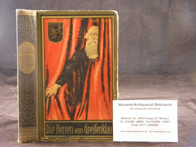 MAY, Karl: Die Herren von Greifenklau. Hrsg. von E.A. Schmid und Franz Kandolf. Volksausgabe. Radebeul (Karl May), 1930. 487 S. farb. ill. OHLn. etwas schief gelesen, vorderes Gelenk gelockert. = Gesammelte Werke, Bd. 59.