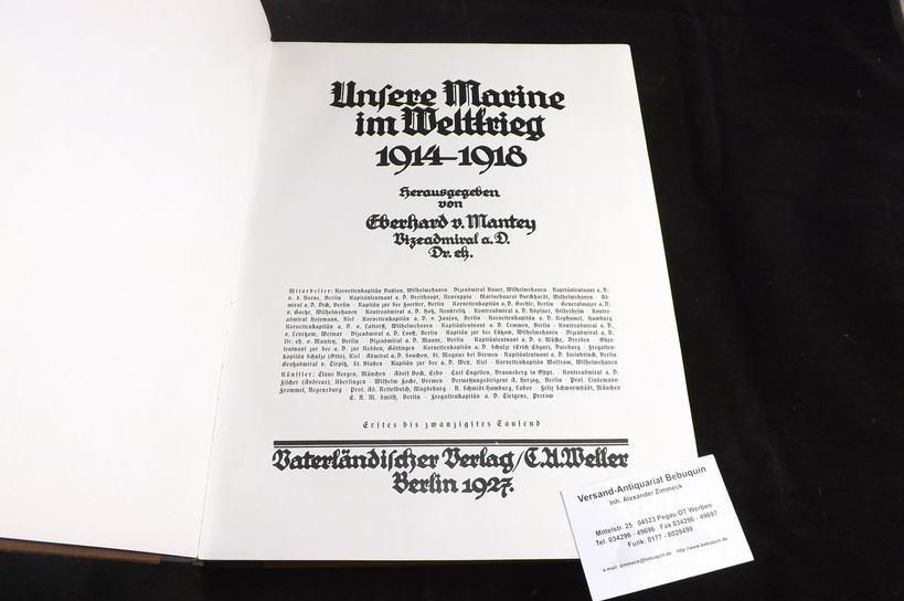 SCHIFFAHRT.– MANTEY, Eberhard v.: (Hrsg.) Unsere Marine im Weltkrieg 1914 – 1918. Berlin (Vaterländischer), 1927. Fol. VIII, 490 Seiten, 1 Blatt mit sehr zahlreichen, teils farbigen Abbildungen (teils auf Tafeln), einigen Faksimiles sowie teils gefalteten farbigen Karten. OHLdr mit Goldprägung. sehr feines Ex. EA.