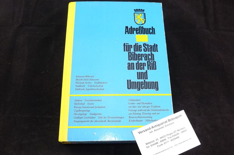 BIBERACH.– ADRESSBUCH DER STADT BIBERACH AN DER RISS 1980.– Mit den Gemeinden: Mittelbiberach, Ummendorf, Warthausen nach dem Stand vom Mai 1980. Karlsruhe (KBK), 1980. Gr. 8°. 80, 591, 48 S. mit zahlr. Abb. + dem Stadtplan inliegend. ill. OHLn. sehr gut erhalten.