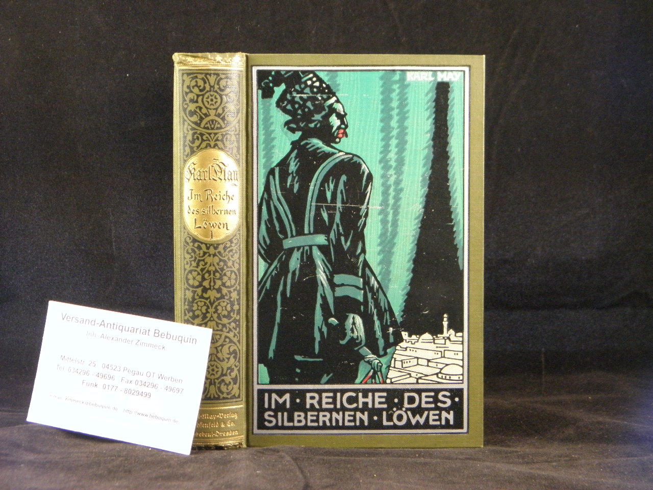 MAY, Karl: Im Reiche des silbernen Löwen. I. Band. 85.– 94. Tsd. Radebeul (Karl May), (1927). 491 (4) S. mit Pressestimmen. farb. ill. OLn. Vorderdeckel mit kleinem Kratzer, Ex libris, sonst feines Ex. mit glänzendem Rückengold. = Gesammelte Werke, Bd. 26. Hermesmeier / Schmatz GW26.13.