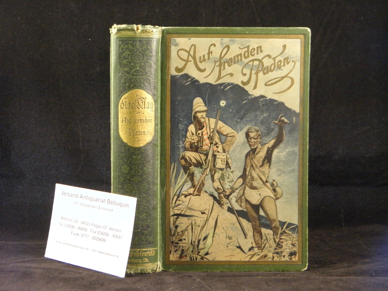 MAY, Karl: Auf fremden Pfaden. Reiseerlebnisse. 10.– 15. Tsd. Freiburg (Fehsenfeld), 1897. 598 (5) S. farb. ill. OLn. Ecken und Kanten etwas bestoßen, zwei Seiten mit Tesareparaturen, sonst gutes Ex. mit glänzendem Rückengold. = Gesammelte Reiseerzählungen, Bd. XXIII. Plaul 294.2.