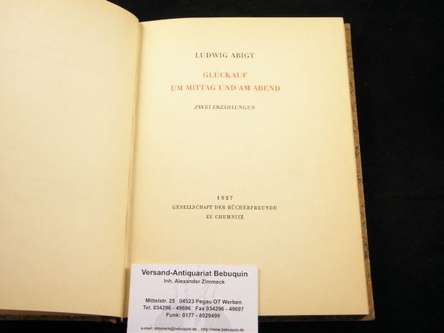 ABIGT, Ludwig: Glückauf um Mittag und am Abend. Zwei Erzählungen. Chemnitz (Bücherfreunde), 1927. Gr. 8°. 123 (1) S. OHLdr mit blindgeprägter Rückenschrift. feines Ex. = 27. Veröffentlichung der Gesellschaft der Bücherfreunde zu Chemnitz. Nr. 144 von 300 Ex. dieser ersten Veröffentlichung Abigts mit dessen eigenhändiger Signatur am Druckvermerk.