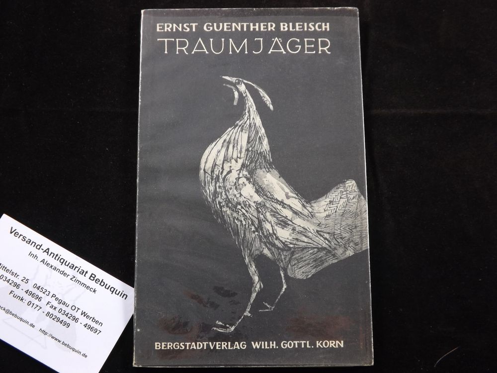 BLEISCH, Ernst Guenther: Traumjäger. München (Bergstadt), 1954. 47 S. mit Titelill. von Rudolf Schlichter sowie mont. Ill. und Umschlagill. von K. Hoggmann-Nagorsen. ill. OKart. recht seltene EA des Erstlingswerks mit einer fünfzeiligen, signierten Verfasserwidmung auf Vortitel.