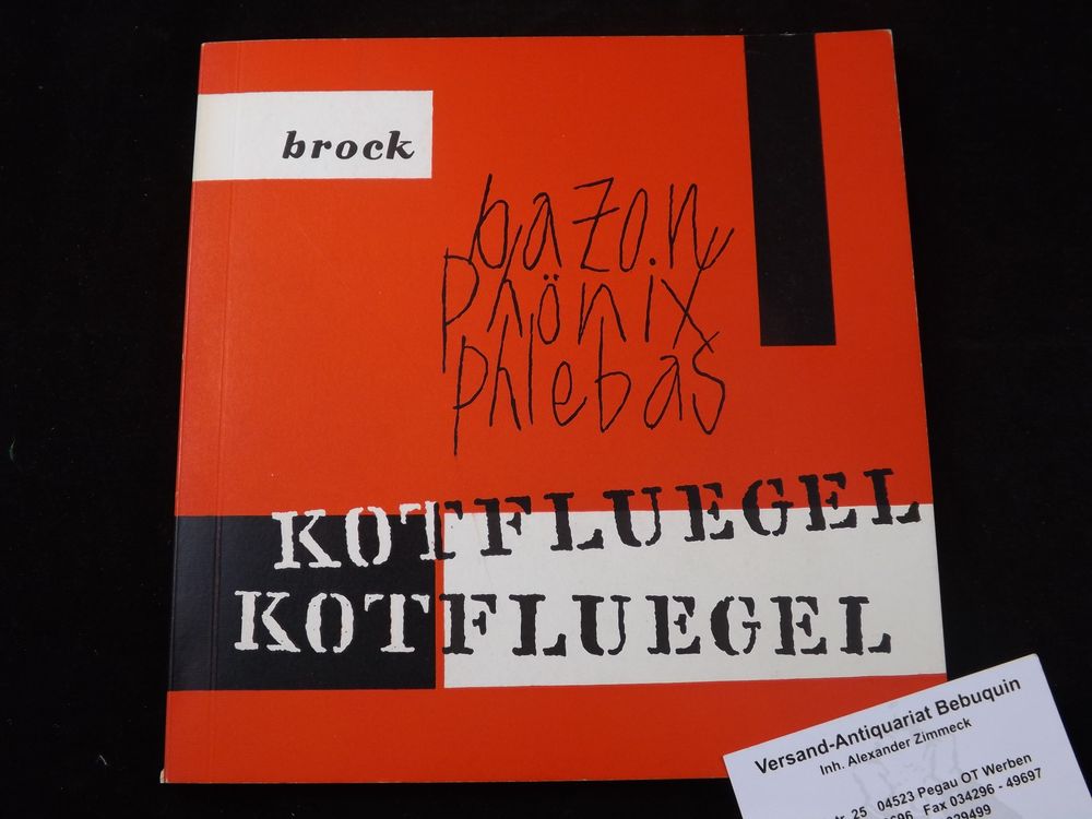 BROCK, Bazon: Kotfluegel. Sprechmaschine nackt im Damenjournal. 80 junge Papierschnitzel oder die Entwicklung eines Wortkonzerts in durchgeführter Sprache mit einer Anleitung zum vergnügten und gelassenen Sterben samt allgemeiner Beleuchtung sowie einer Theorie des Himmels. Bazon Brock Phönix Phlebas Natus 1936 Denatus. Itzehoe (Geeorge), 1957. 21 x 20 cm. 52 S. ill. OKart. von E. Rustmeier und K. P. Dienst. WaV (vielleicht von Brock selbst). EA des Erstlingswerks dieses Vorläufers von Neodadaismus und Konkreter Poesie.