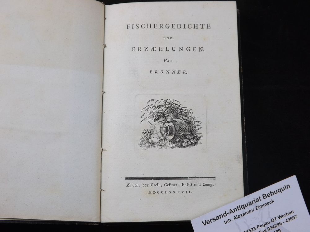 BRONNER, Franz Xaver: Fischergedichte und Erzaehlungen. Mit einer Einleitung von Salomon Gessner. Zürich (Orell, Gessner, Füssli), 1787. kl. 8°. 174 S. mit gestochener Titelvignette von Salomon Gessner. Pb. der Zeit. gutes Ex. EA des Erstlingswerks Bronners (1758-1850), größtenteils während seiner Donauwörther Zeit entstanden und stark von Salomon Gessner beeinflußt, von diesem auch mit einem Vorwort versehen. „Bronner stammt aus Höchstädt an der Donau, war einige Jahre Benediktiner in Donauwörth und dort Schüler Beda Mayrs, floh dann in die Schweiz und fand dort eine neue Existenz.“ Goedeke IV/1, 105, 1. Hayn/Gotendorf I, 473. Rümann 120.
