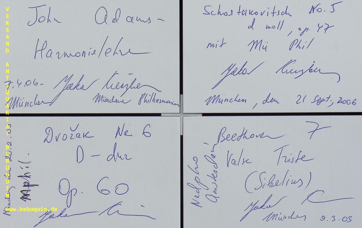 KREIZBERG, Jakov (Dirigent): 9 eigenhändig signierte und datierte Autogrammkarten mit diversen auch eigenhändigen Programmbeschreibungen. München, 2000 – 2009. 8 x 12,5 cm. 9 Karteikarten. Yakov Kreizberg (* 24. Oktober 1959 in Leningrad; † 15. März 2011 in Monte Carlo), war ein US-amerikanischer Dirigent russischer Abstammung und österreichischer Staatsbürger. (Wikipedia)
