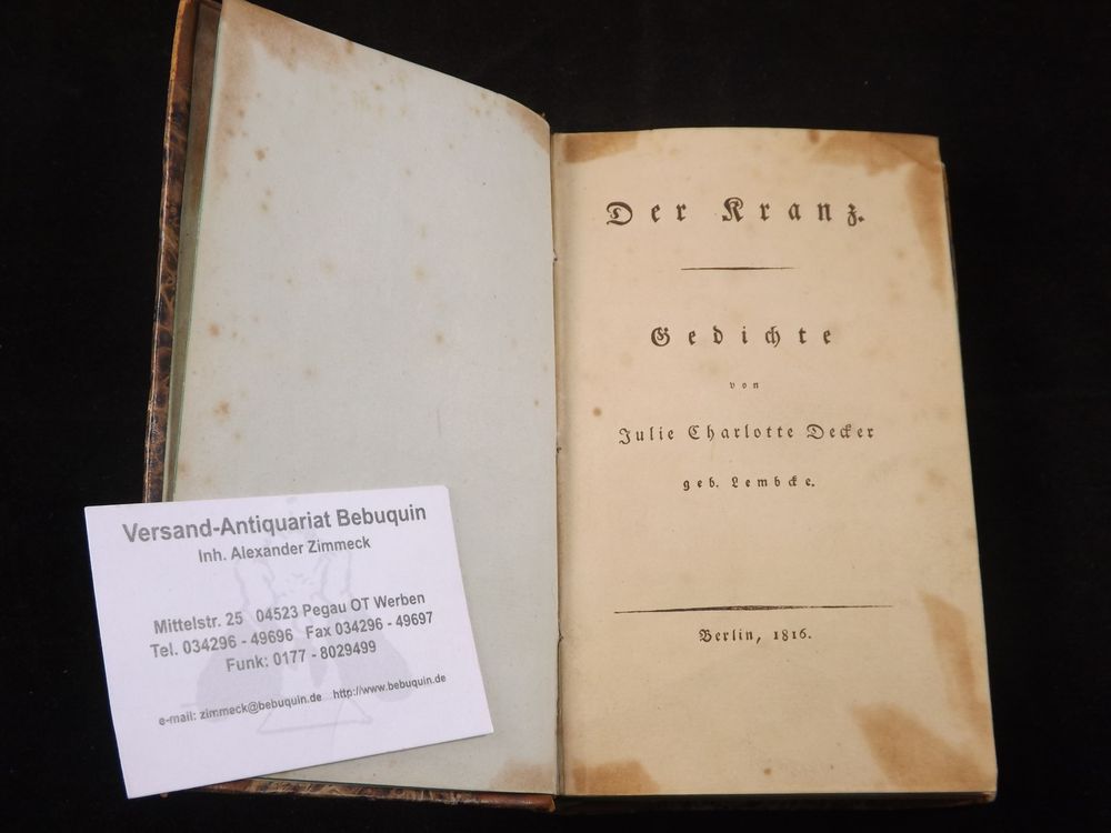 DECKER, Julie Charlotte: Der Kranz. Gedichte. Berlin (Dümmler), 1816. kl. 8°. XXVIII, 274 S. mit 1 gefalteten Notenblatt. OHLdr. mit goldgeprägtem Rücken. eine Ecke mit Schmutzrand