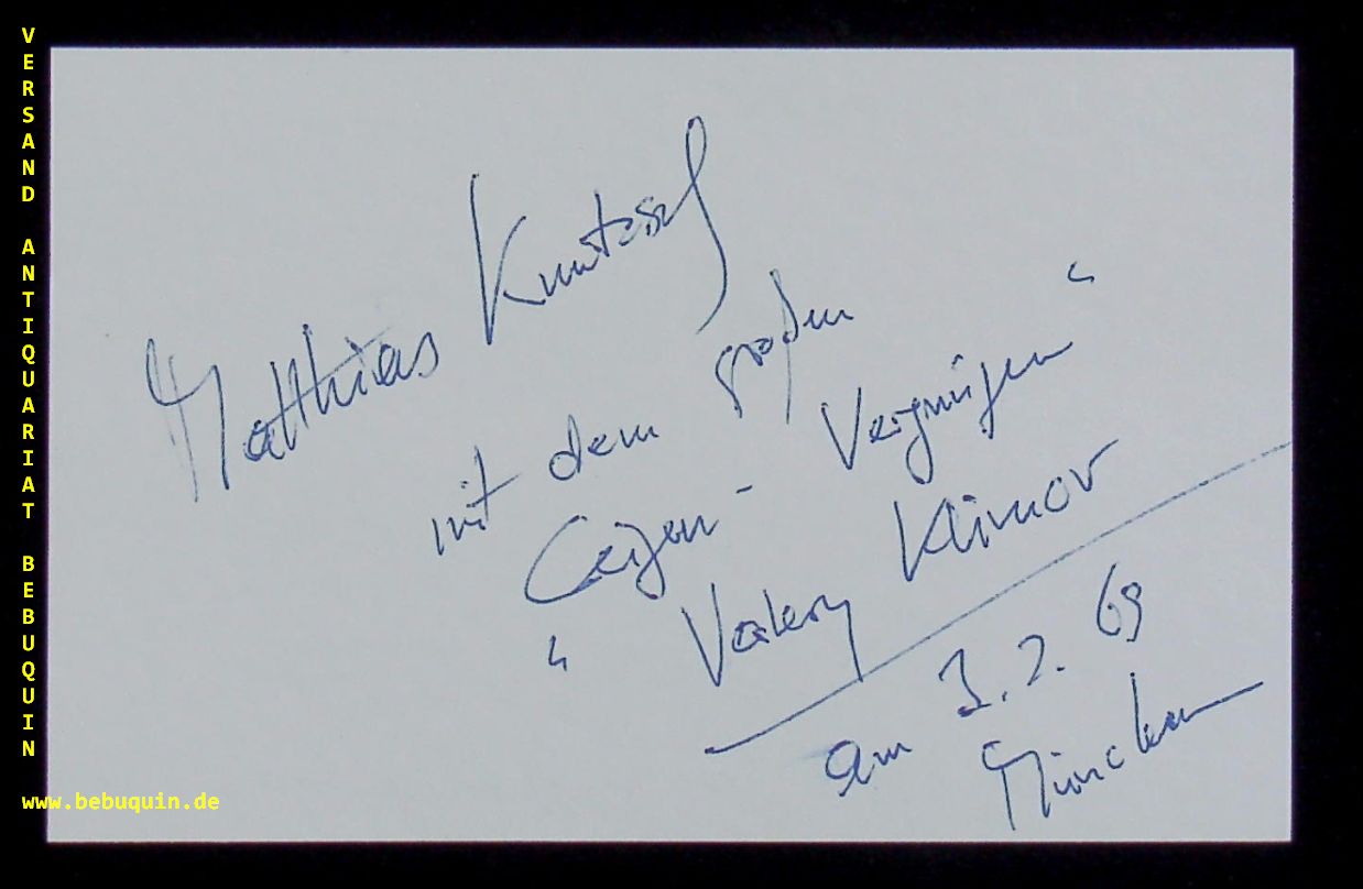 KUNTZSCH, Matthias (Dirigent): eigenhändig signierte und datierts Autogrammkarten: Mit dem großen Geigen-Vergnügen Valery Klimov. München (Kongresssaal), 3.2.1969. 8 x 12,5 cm. Karteikarten. Matthias Kuntzsch (* 22. September 1935 in Karlsruhe) ist ein deutscher Dirigent, der in den Vereinigten Staaten lebt. (Wikipedia)