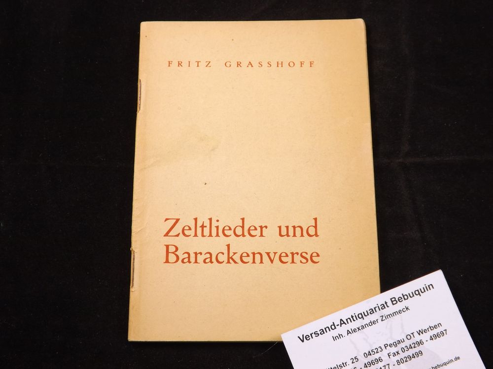 GRASSHOFF, Fritz: Zeltlieder und Barackenverse. Lütjenburg (Klopp), 1944. 48 S. OKart. kaum gebräunt. seltene EA des Erstlings Kosch VI, 725. Fritz Graßhoff (nach seiner Auswanderung auch: Fritz Grasshoff, * 9. Dezember 1913 in Quedlinburg; † 9. Februar 1997 in Hudson, Kanada) war ein deutscher Zeichner, Maler, Schriftsteller und Schlagertexter. (Wikipedia)