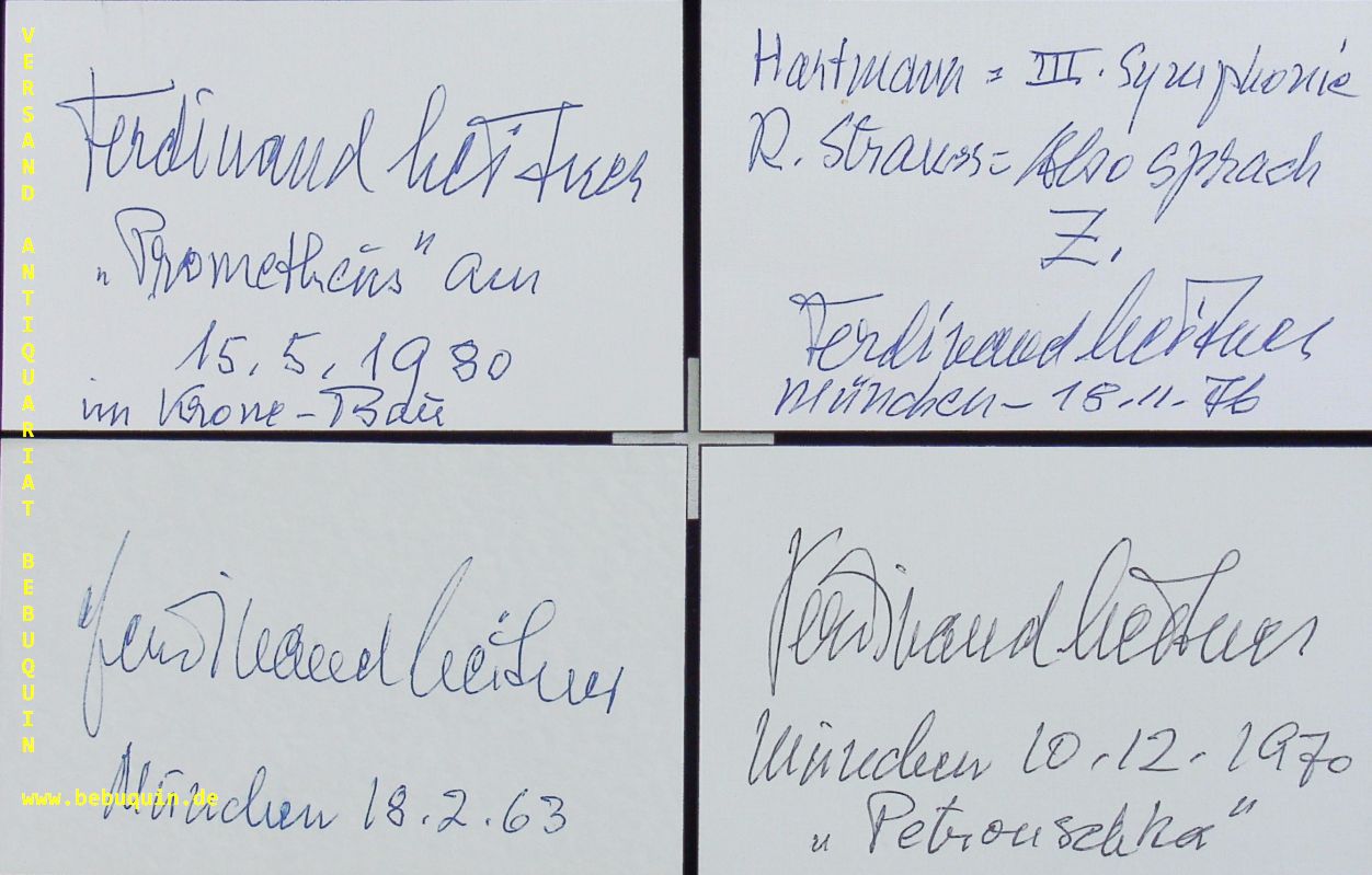 LEITNER, Ferdinand (Dirigent): 6 eigenhändig signierte und datierte Autogrammkarten. München (Philharmonie), 1963 – 1986. 8 x 12,5 cm. 6 Karteikarten. fein signierte Stücke. Ferdinand Leitner (* 4. März 1912 in Berlin; † 3. Juni 1996 auf der Forch bei Zürich) war ein deutscher Dirigent. (Wikipedia)